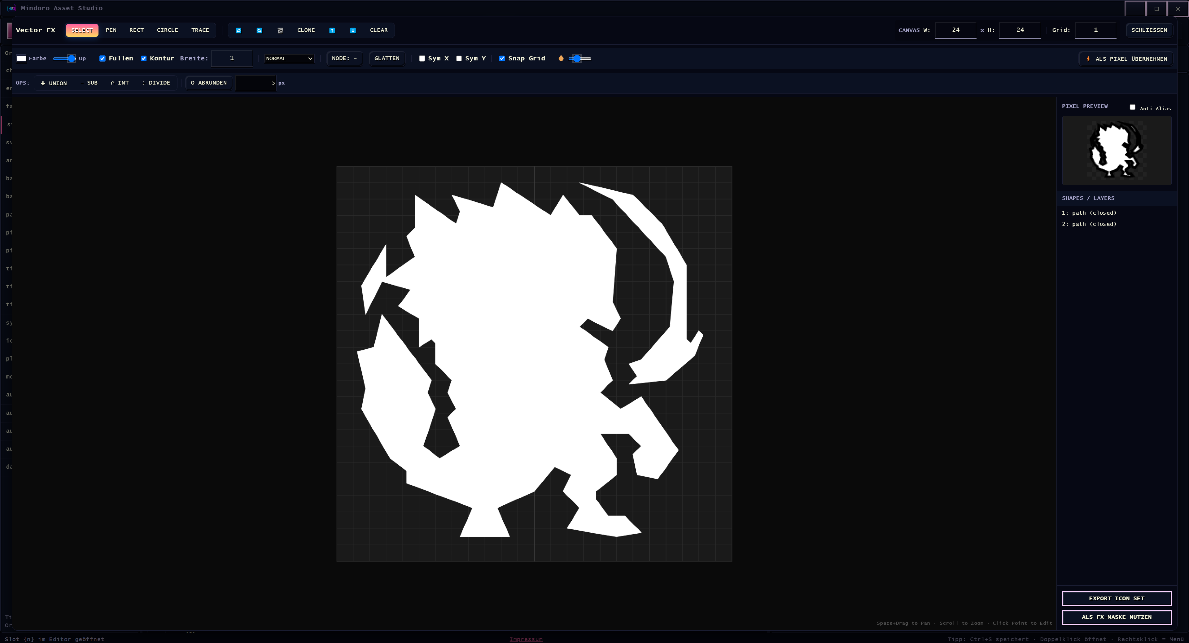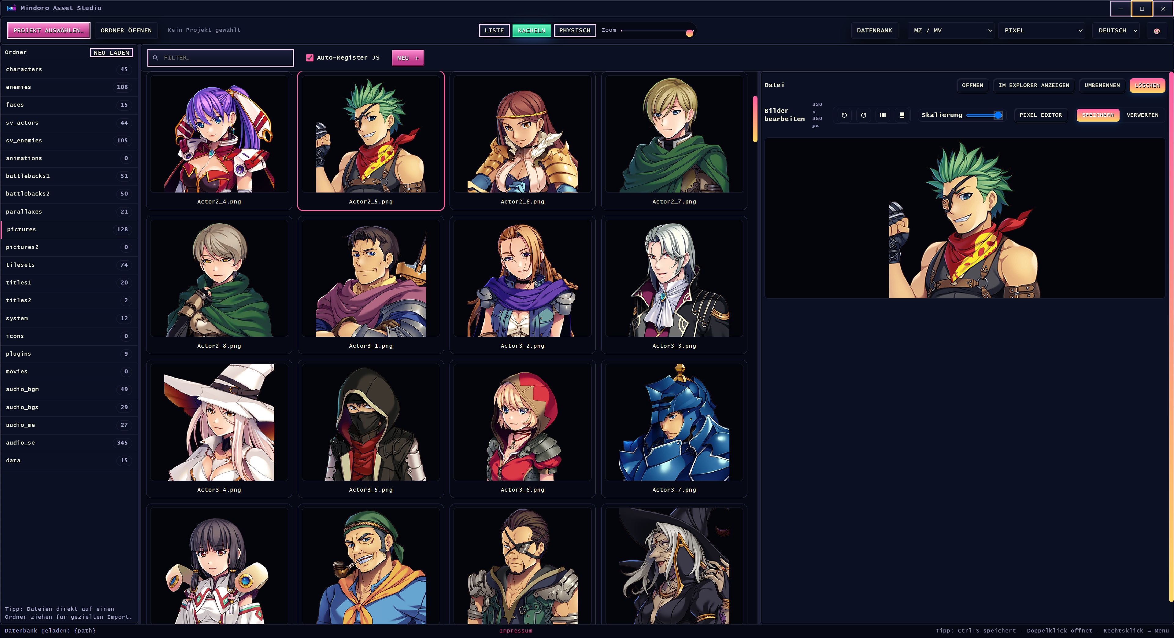 - Engine-unabhängig: Pixel Editor, Animation Editor, Vector Editor, Tileset Editor, Text Editor