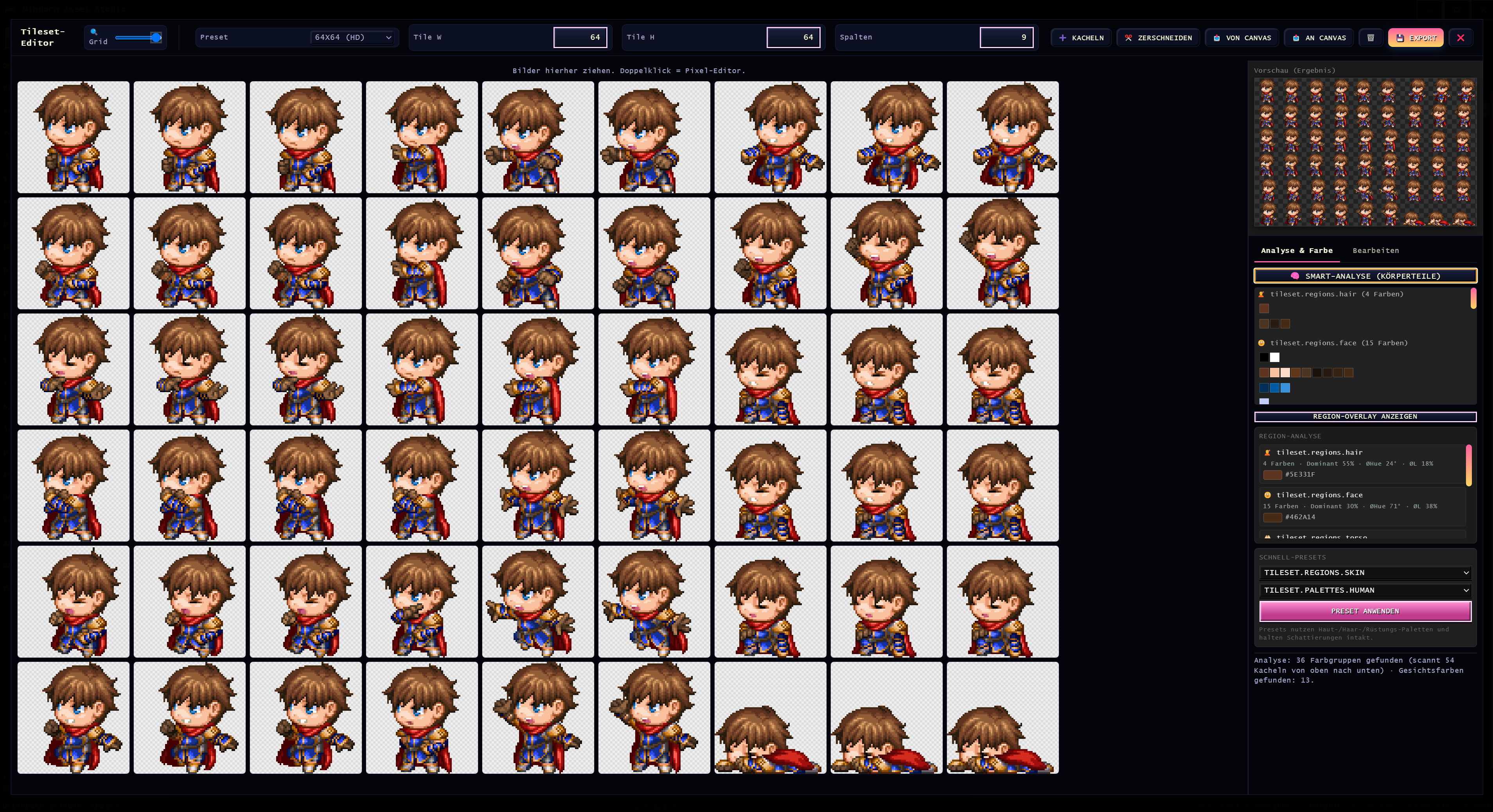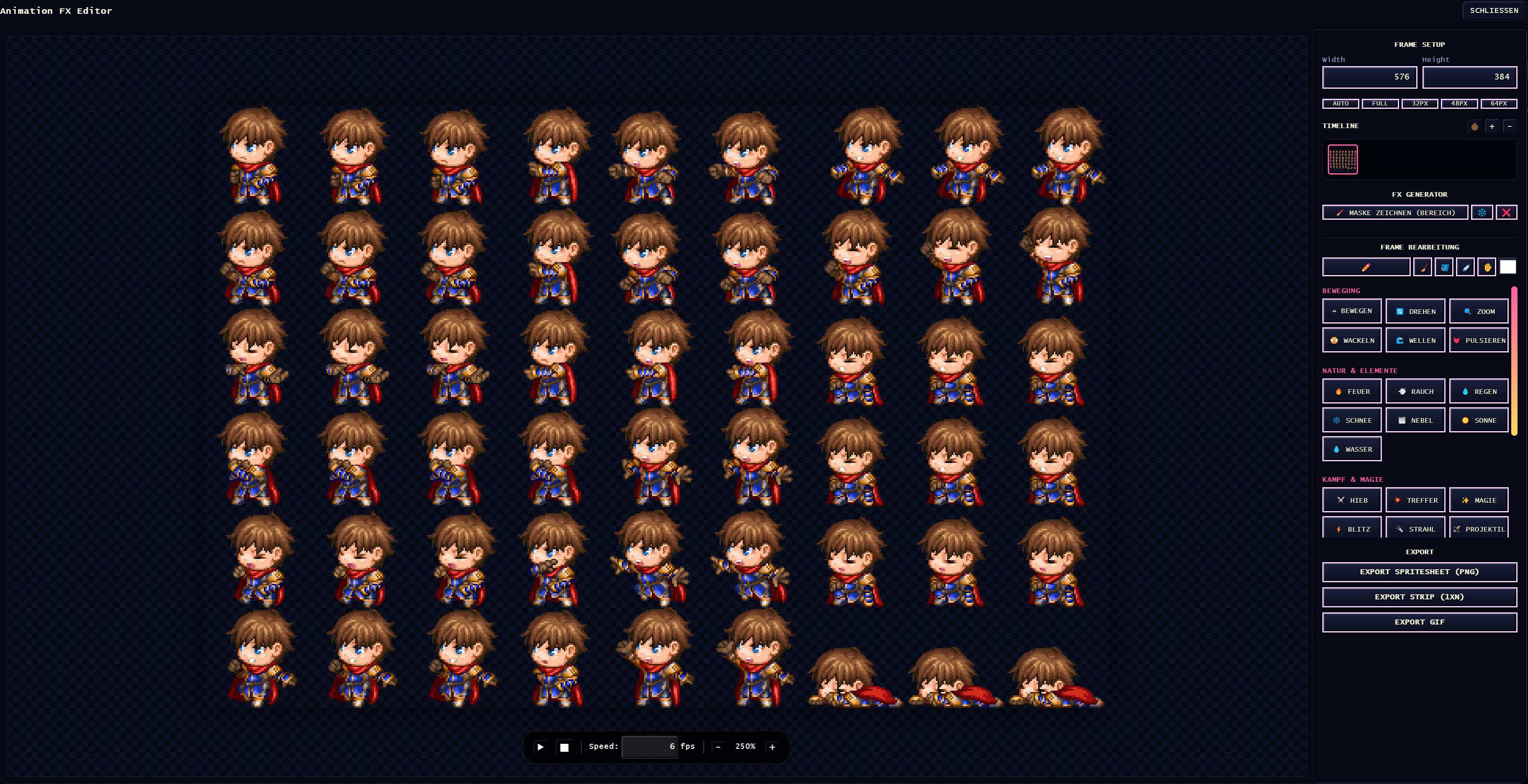 - Export: PNG, GIF, Spritesheet (Grid/Strip), Einzelne Frames
