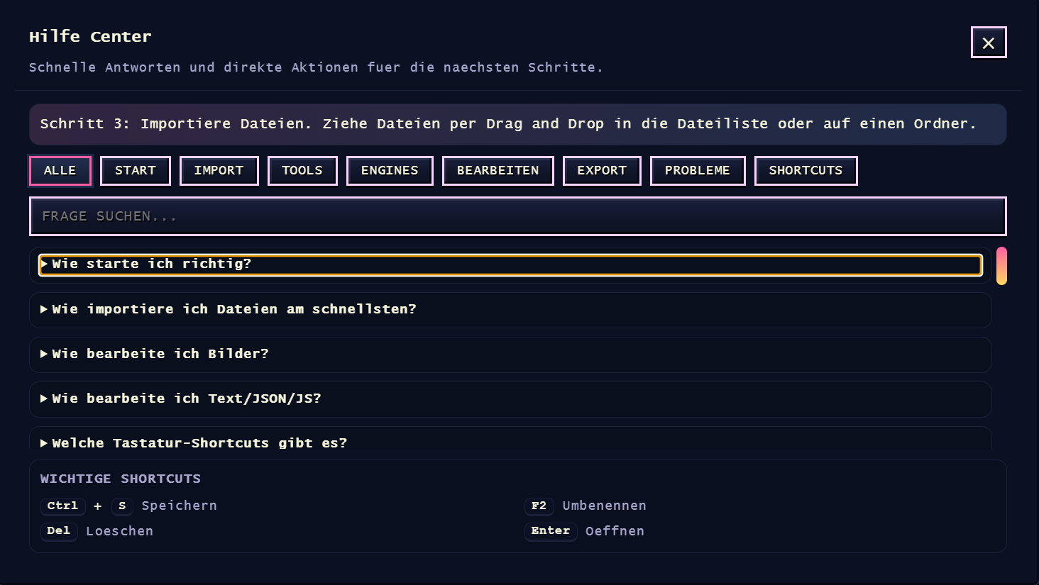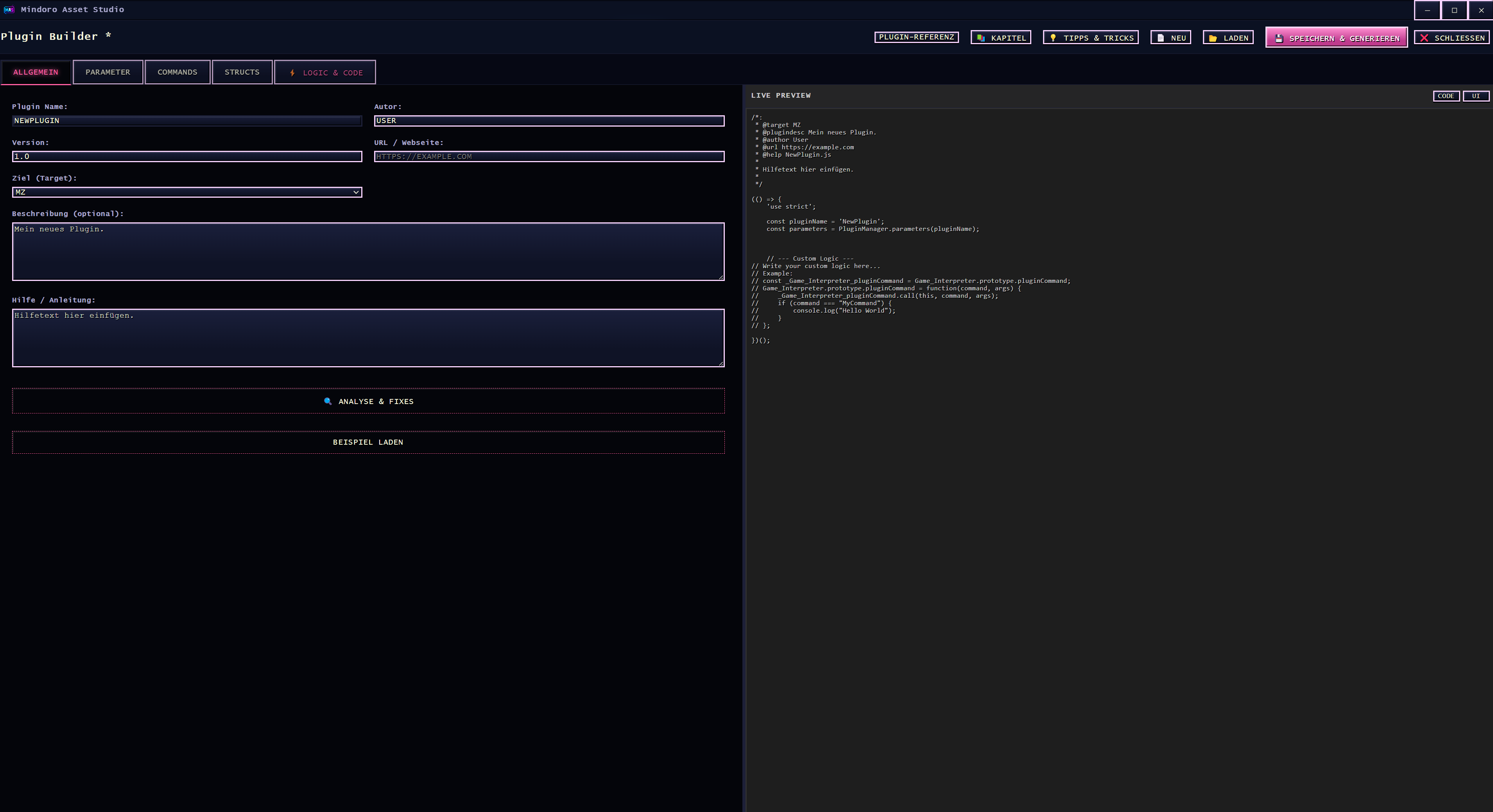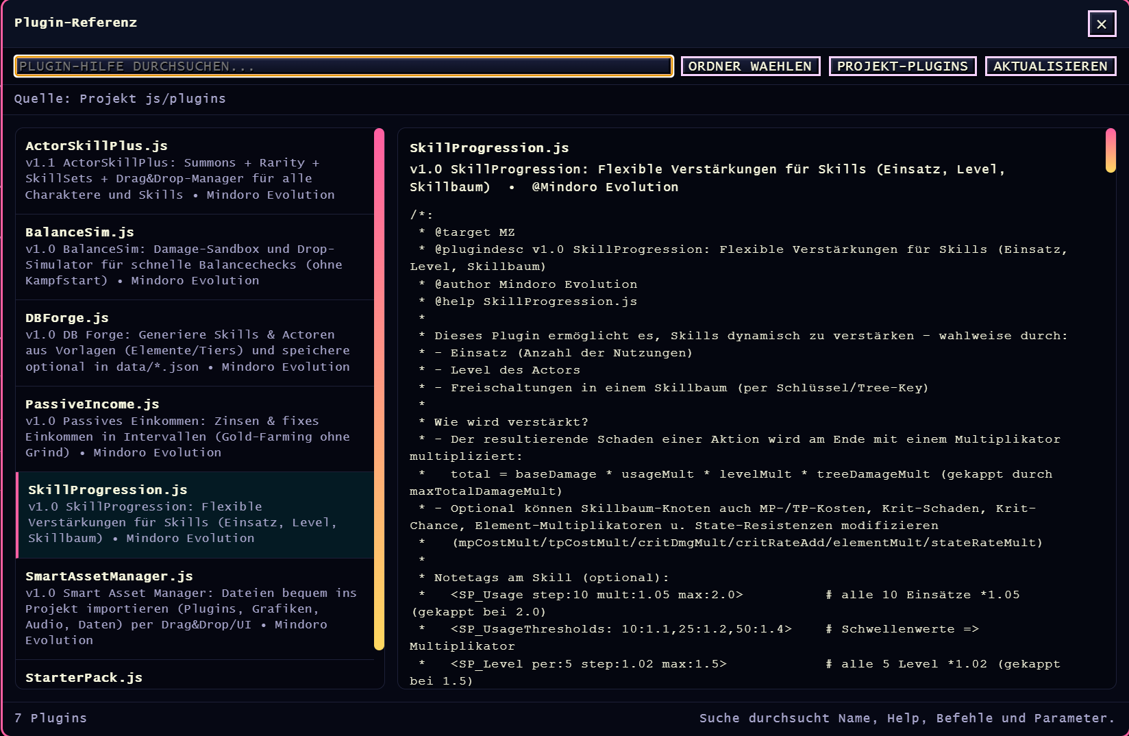Zur Frage nach einer durchsuchbaren Referenz-Ansicht für Plugin-Help-Sektionen: Das ist technisch problemlos machbar und inhaltlich absolut sinnvoll. Ich arbeite aktuell an einer ganzen Reihe neuer Features, da das Tool langfristig für mehrere Engines ausgelegt ist. In dem Zuge ist auch ein größeres Update für den Plugin Builder geplant, und solche Wünsche werden dabei mit berücksichtigt.